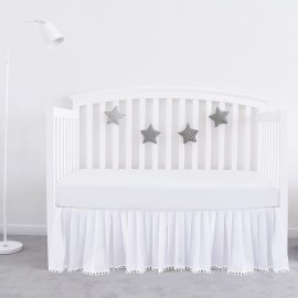 Crib Bed Skirt White for Girls Boys Pleated with Tassel Pompoms Dust Ruffled 14 Drop, Fit All Standard Crib Toddler Bed Skin-Friendly & Soft Machine Washable Nursery Bedding Skirts