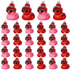 Chivao 24 Pcs Valentine Mini Rubber Duck with 24 Sunglasses 24 Hat 24 Necklace, Yellow Valentine Rubber Duck in Bulk Bath Toys for Kids Classroom Gift Exchange