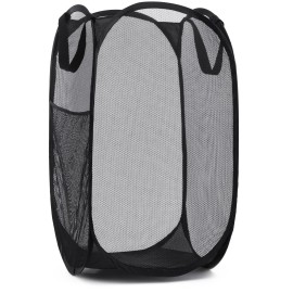 Handy Laundry Collapsible Mesh Pop Up Hamper with Wide Opening and Side Pocket - Breathable, Sturdy, Foldable, and Space-Saving Design for Clothes and Storage. (Black)