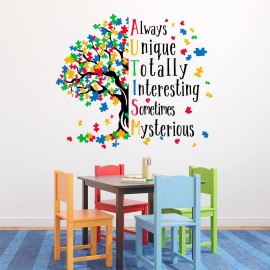 Mfault Autism Awareness Day Inspirational Sign Wall Decal Sticker, Positive Puzzle Piece Tree Colorful Nursery Classroom Decoration Baby Bedroom Art, Autistic Spectrum Motivational Kid Room Decor Gift