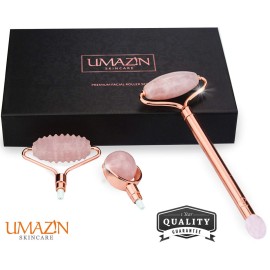 UMAZIN Metal Facial Jade Roller Set - All Natural 100% Authentic Jade Rose Quartz Stone - 3in1 Acupuncture Face Roller for Wrinkles Antiaging Firming Skin - Jade Roller for Face Forehead Neck Body
