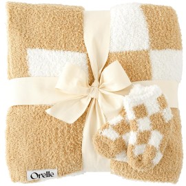 Orelle Checkered Baby Blanket & Matching Socks Set | Cozy Baby Blanket | Soft Plush Blankie | Gender Neutral Checkered Nursery Decor | Newborn Registry Must Have | Beige