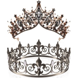 Junkin 2 Pcs Crowns for Men Women Baroque Queen Crown King Prince Tiara Princess Crystal Headband Rhinestone Prom Party (Black)