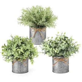 Mkono Small Fake Plants in Farmhouse Galvanized Metal Pots 3 Pack Potted Artificial Plant Eucalyptus for Laundry Room Bathroom Shelf Table Decor