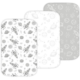 Bassinet Sheets for Maxi-COSI Iora, Papablic 2 in 1 Bonni, Cowiewie Baby Bassinet Bedside Sleeper, 3 Pack, 33x20 Inch, Ultra Soft, Breathable Snug Fit, Unisex Boys Girls, Gray White (Space Rockets)