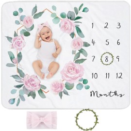Baby Monthly Milestone Blanket for Baby Girl, Newborn Age Months Blanket Photo Prop with Growth Chart, Floral Wreath & Headband