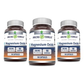 Magnesium Oxide 500mg Per Serving Supplement Pack of 3 units 90 Servings Per Bottle, 1 Capsule Per Serving Non-GMO, Gluten Free, Third Party Tested Manufactured in accordance with GMP Standards Proudly made in the USA with Guaranteed Purity & Potency..