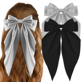ATODEN Oversized Long Tail Satin Bow Hair Clips and Barrettes - Silky Large Aesthetic Hair Accessories for Women, Grey Black