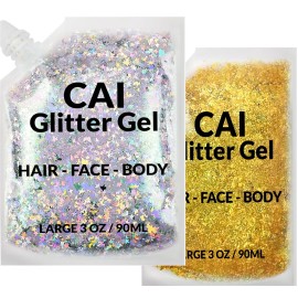 Face, Body & Hair Glitter Gel - Halloween Glitter for Kids and Women - 3 Oz Cosmetic-Grade Gel w/Moon & Stars for Festivals & Halloween Party, Easy Apply & Wash Off - Gold 2Pack
