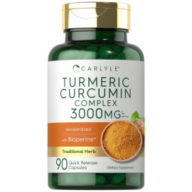Carlyle Turmeric Curcumin Supplement with Black Pepper | 3000mg | 90 Capsules | Complex Extract with Bioperine | Non-GMO, Gluten Free