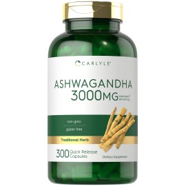Carlyle Ashwagandha Supplement for Women and Men | 3000mg | 300 Capsules | Herb Root Extract with Black Pepper | Non-GMO and Gluten Free