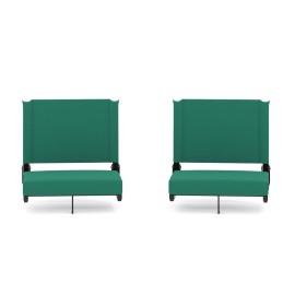 - Comfortable Stadium Seat with Back Support: Equipped with a bungee reinforced padded seat that is 17" wide and 14" deep for maximum comfort. Features a supportive 15" high backrest so you can enjoy outdoor and sporting events without a sore back. | Sturdy Design: This padded bleacher chair is constructed with a durable aluminum frame. Sturdy yet lightweight, this stadium seat for bleachers weighs 5.3 pounds and can accommodate up to 250 pounds. | Bleacher Hook for Stability and Safety: The bleacher hook on the bottom of the seat will keep it securely in place to prevent sliding and leaning so you can safely cheer with your family and friends without fear of falling. | Water-Resistant Cushions: The perfect bleacher seat with cushions made from durable canvas fabric that provides water resistance for those rainy days and breathability for those scorching summer days. | Easy Transport and Compact Storage: Folds down flat for convenient storage and portability. Effortlessly carry this portable stadium seat by utilizing the shoulder strap and built-in cushioned handle.