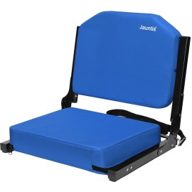 - Comfortable Stadium Seat with Back Support: Equipped with a bungee reinforced padded seat that is 17" wide and 14" deep for maximum comfort. Features a supportive 15" high backrest so you can enjoy outdoor and sporting events without a sore back. | Sturdy Design: This padded bleacher chair is constructed with a durable aluminum frame. Sturdy yet lightweight, this stadium seat for bleachers weighs 5.3 pounds and can accommodate up to 250 pounds. | Bleacher Hook for Stability and Safety: The bleacher hook on the bottom of the seat will keep it securely in place to prevent sliding and leaning so you can safely cheer with your family and friends without fear of falling. | Water-Resistant Cushions: The perfect bleacher seat with cushions made from durable canvas fabric that provides water resistance for those rainy days and breathability for those scorching summer days. | Easy Transport and Compact Storage: Folds down flat for convenient storage and portability. Effortlessly carry this portable stadium seat by utilizing the shoulder strap and built-in cushioned handle.