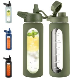CIVAGO 24 oz Glass Water Bottle with Straw and Handle, Large Sports Motivational Water Bottle Flask with Time Marker and 2 Lids, Leakproof Jug Canteen with Silicone Sleeve for Gym, Sage..