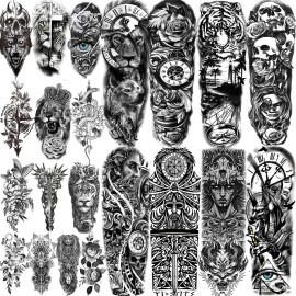 COKTAK 64 Sheets Large Black Arm Temporary Tattoos For Men Forearm Women Thigh, Half Sleeve Animals Lion Tiger Wolf Temp Tattoo Stickers Adults, Death Skull Compass Flower Fake Tattoos That Look Real
