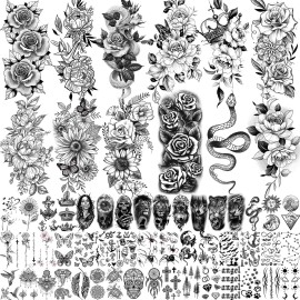 COKTAK 59 Sheets Sexy 3D Rose Flower Temporary Tattoos For Women Girls Arm Neck, Snake Floral Sunflower Leaf Peony Fake Tattoo Sticker Adult, Black Realistic Temp Tatoos Moon Dandelion Butterfly Thigh
