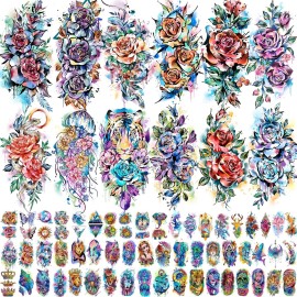 COKTAK 67 Sheets Watercolor Rose Flower Temporary Tattoos For Women Girls, 12 Sheets Colorful Arm Sleeve Tattoos For Adults Floral Snake Tiger, 53 Sheets Groovy Small Semi Permanent Fake Tattoos Kids