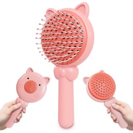 Retractable Hair Brush Pink Pig Designed - Compact 7.87 3.66 Inches Self Cleaning Hair Brush for Women with Magnetic Attach - Effective Detangling & Self Cleaning Hairbrushes with Soft Bristles