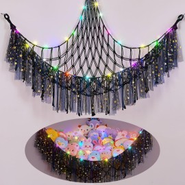 - Hanging Stuffed Animals Storage: Toy organizer decorated with colorful lace tassels, and come with LED String light which can be used as a night light; The room storage is not only keeping kids bedrooms more organized but also adding warm atmosphere to the corner of the room | Space Saving: Wall hanging design, our stuff animal hammock can hang in a corner of the wall, will not take up extra floor space; Keep kids' bedroom tidy and spacious; Ideal for nursery, preschool, playroom, kids bedroom, large enough to hold stuffed animals | Material: Our net for stuffed animals is made of premium hand-woven rope, will not loosen or leak, which is durable; Equipped with metal rings for hanging; Our stuffed animals holder size is 39.4 x 39.4 x 59 inches | Ideal Choice: The nursery organization must be a great choice for kids, beautiful appearance and storage function; And children will develop good habits to storage toys, it is a great way to keep cute stuffed animals on display | Easy to Install: Package included, 1 pack stuffed animals hammock, LED String light, 3 pcs hooks; It is easy to mount the kids toy storage on the room corner; To avoid flipping over, please keep the three hooks on the same level; NOT including batteries