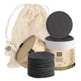 Greenzla Reusable Makeup Remover Pads - 20 Pack Organic Dark Charcoal Bamboo Cotton Pads with Mesh Laundry Bag, Cotton Travel Pouch, & Cotton Rounds Holder, Sustainable Face Wipes for All Skin Types