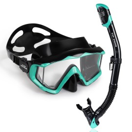 Snorkel Set Pano 3 Window Adult Snorkeling Gear, Professional Snorkel Goggles Anti-Fog Diving Mask, Anti-Leak Swim Goggles and Dry Top Snorkel for Diving, Snorkeling, Swimming (Black/Aqua)