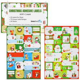 Iconikal 600-Count Christmas Gift Tags Labels with Assorted Printed Designs for Boxes, Bags, Stocking Stuffers, Self-Adhesive, Party Favors, and More