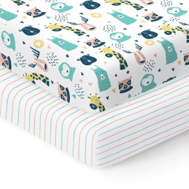 100% Organic Cotton Fitted Mattress Sheets for Graco Pack n Play, Babyletto, Pamo Babe, Dream on Me, Evenflo, Baby Trend Portable/Mini Crib/Playards, and Beka Bedside Bassinet 2 Pk Animal & Stripe