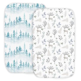 100% Organic Cotton Fitted Mattress Sheets for Graco Pack n Play, Babyletto, Pamo Babe, Dream on Me, Evenflo, Baby Trend Portable/Mini Crib/Playards, and Beka Bedside Bassinet 2 Pk, Deer and Forest