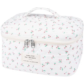 Large Travel Quilted Makeup Bag for Women,Big Floral Cotton Cosmetic Bag, Cute Coquette Aesthetic Floral Toiletry Organizer Bag (White Cherry)