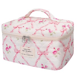 Large Travel Quilted Makeup Bag for Women,Big Floral Cotton Cosmetic Bag, Cute Coquette Aesthetic Floral Toiletry Organizer Bag (Pink pattern)