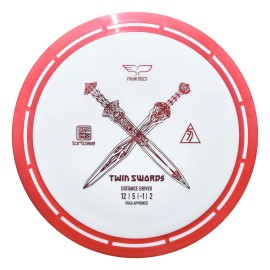 The Disc Golf Disc Twin Swords is the first roll-out disc model from Yikun in Tortoise Line plastic which is an overmold Shell configuration. The rim is attached to the flight plate through our own, unique method, giving the discs an amazing look. The Twin Swords is a distance driver with a Speed 12 rating and wide, yet comfortable rim width. The T..