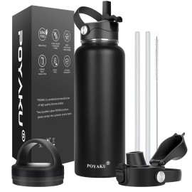 Water Bottle Insulated 32oz 40oz 64oz 128oz Straw Lid Spout Lid & 3 Lids, Leak Proof, Vacuum Insulated,Stainless Steel Water Bottle Wide Mouth for Sports, Gym or Office (Magic Black, 40 oz)