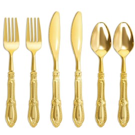 Use this gorgeous gold plastic cutlery set to elevate the next gathering you have. This plastic silverware set is designed to add a touch of elegance to any event. It includes forks, knives and spoons. The set is made of high-quality, food-grade plastic, which is both safe and durable, while maintaining a light and elegant texture. The exquisite go..