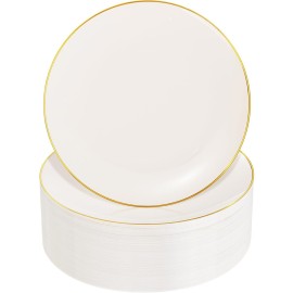 Nervure 100Pcs Ivory and Gold Plastic Plates - 10.25inch Disposable Ivory Dinner Plates - Heavy Duty Plastic Plate Ideal for Wedding & Party & Thanksgiving