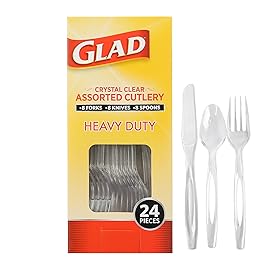 Glad Heavy Duty Crystal Clear Assorted Plastic Cutlery are you need for your next meal. Each set includes 8 plastic, disposable forks, 8 knives, and 8 spoons for a total of 24 pieces. Disposable cutlery is extra heavy weight, strong, and shatter resistant. The crystal plastic cutlery is high end and made of great quality. Disposable and easy to use..