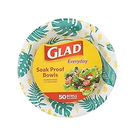 Glad Soak Proof Everyday bowls make mealtime easy. Made from the highest quality materials to prevent liquids from seeping through, these strong, durable, and beautiful paper plates will instantly dress up any dinner, dessert, snack, or meal at your table setting. These palm leaves paper bowls are disposable, making cleanup easy for everyone. You c..