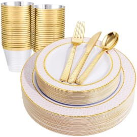 Ciaell 150PCS Clear Gold Plastic Plates - Disposable Gold Rim Plates include 25Dinner Plate, 25Dessert Plate, 25Forks, 25Knives, 25Spoons, 25Cups for Wedding & Party & Christmas & New Year