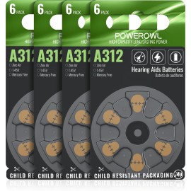 POWEROWL 24 Count Hearing Aid Batteries Size 312, High Capacity Cell, Long Lasting 312A battery