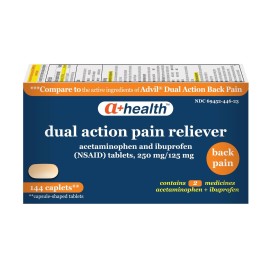 A+ Health Acetaminophen and Ibuprofen Dual Action Pain Reliever caplets contain 250 mg of Acetaminophen and 125 mg of Ibuprofen. Compare to the active ingredients in the National Brand. Contains 2 medicines in one caplet to provide temporary pain relief due to headache, backache, muscular aches, toothache, menstrual cramps and minor pain of arthrit..