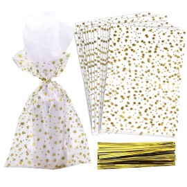 COQOFA 100 Pcs Star Printed 6X10 Gift Wrap Cello Cellophane Treat Bags Party Favor bags Clear Candy Cookie Bags Plastic Poly Goodie Storage Bags with Twist Ties for Bakery,Birthday, Wedding ,Party Decorations (Gold)
