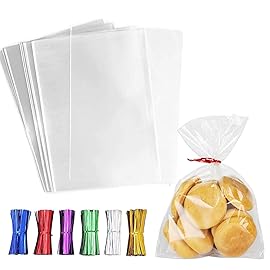 LEOSINDA 50 pcs Clear Cellophane Bags,12X 16 Large Clear Cellophane Treat Bags with Colors Twist Ties for Gift Baskets Wedding Chocolate,Party Favor r Baby ShowersBakeryToy Wrapping