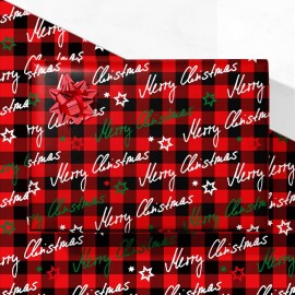 Add cozy holiday cheer to your gift-giving with the GIOLNIAY Merry Christmas Wrapping Paper. This design features bold red and black buffalo plaid as the backdrop for festive handwritten Merry Christmas script in white and green, paired with scattered star icons that add a whimsical feel. Perfect for rustic or modern Christmas decor, these 28 x 40-..