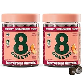 - 8 DAILY GREENS: Delicious peach gummies made from 8 Super Greens: Spinach, Wheatgrass, Kale, Blue Green Algae, Spirulina, Aloe Vera, Chlorella & Barley Grass. Chew 2-4 gummies a day - GREENS ON THE GO: 8Greens matches your busy lifestyle! Whether youre at work, traveling, or out and about, these Daily Greens Gummies make it easy to get your essen..