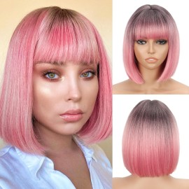 WERD Short Pink Bob Wig for Women Ombre Pink Wig With Bangs Synthetic Hair Straight Pink Bob Wig for Daily Party Cosplay