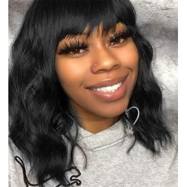 Product Information: Package: 1 * short wavy black bangs wig 2* wig caps Other goodies Item Material: Heat friendly synthetic fiber Wig Advantage: Less shedding and tangling, lightweight and super soft, just as real human hair Bob Wig Style: Short wavy wig with bangs Wig Length: 12 Inch Wig Color: 1b/Natural black Wig Cap Size: Average 22in, can be..