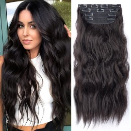 Black 20 Inch Thick Hairpieces Long Wavy Natural Synthetic Clip in Hair Extensions, for Women (4pcs, 20Inch, 1B)