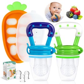 HAOBAOBEI Baby Teether Food Feeder Pacifiers (2 PCs) - Fresh Food Feeder and Silicone Food Pouches in Appetite Stimulating Colors | Includes 2 PCs 3 Sizes Silicone Sacs 100% safe for your child Our HAOBAOBEI Baby Food Feeder is made from the highest food grade silicone, it doesn\'t stain or smell like the mesh feeders do. Its 100% safe for your inf..