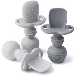 SAMiGO Silicone Baby Spoons Self Feeding 6+ Months - Infant Toddler Utensils - First Stage Baby Led Weaning Feeding Supplies - Set of 3 Pack