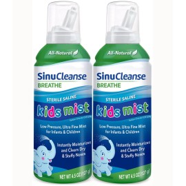 SinuCleanse Sterile Saline Kids Nasal Spray, Ultra Fine Mist, Instantly Moisturizes Dry, Stuffy Noses, Safe for Newborns & Up, 4.5 Oz (2 Pack), Made in USA