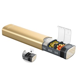 Metal Weekly Pill Organizer, Serfeymi Aluminum Daily Pill Box(Spare Gasket Provided),7 Day Pill Case Travel Medicine Organizer,Pill Containers with Individual Lid for Vitamins,Pills, Supplement-Gold